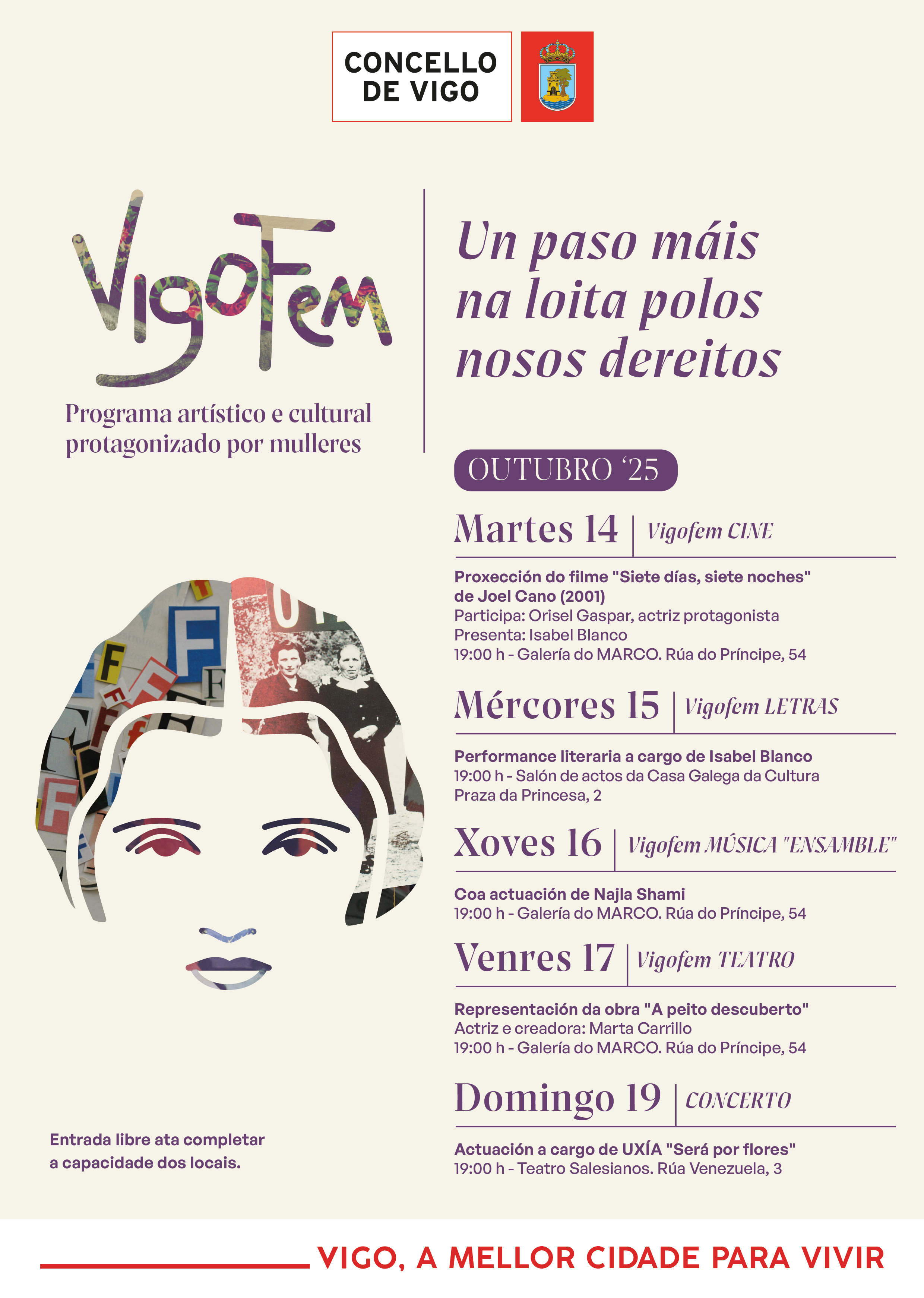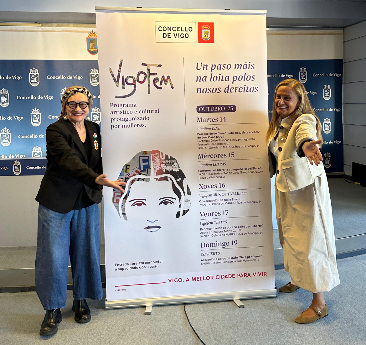 A terceira edición de “VigoFem” despregará, desde o martes 14 ao domingo 19 de outubro, cinco citas culturais protagonizadas por mulleres. “Pretendemos poñer en valor a capacidade transformadora da cultura protagonizada por mulleres poñendo no foco a cultura e as mensaxes que as mulleres queremos trasladar á sociedade”, explicou a tenente de alcalde, na presentación do programa coordinado por Isabel Blanco.
