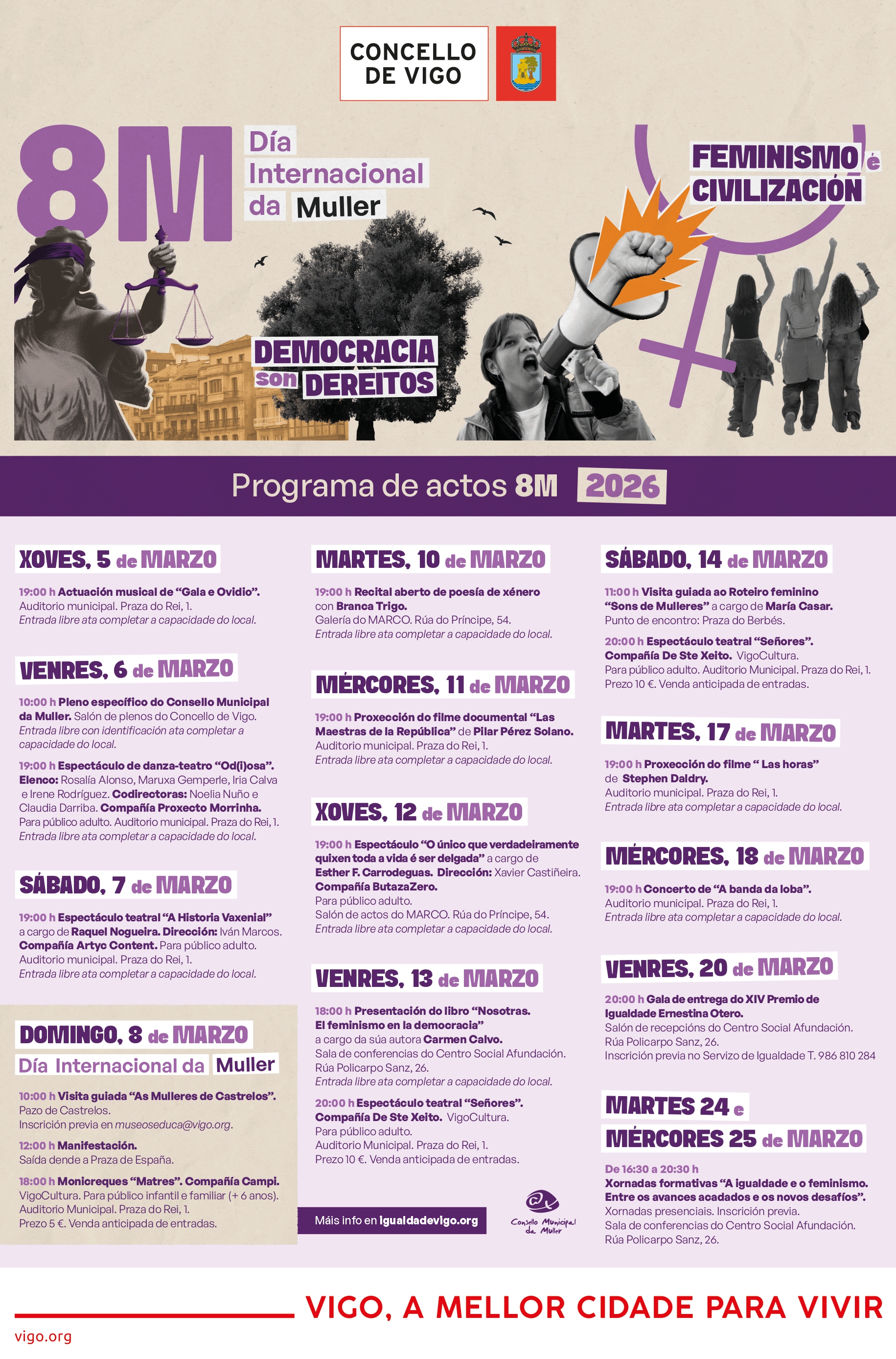 O xoves 5 de marzo arrinca o programa de actos do 8M coa actuación non Auditorio Municipal do “Gala e Ovidio” a partir dás sete dá tarde. O domingo 8 de marzo terá lugar a manifestación que sairá ás 12 do mediodía desde a Praza de España.