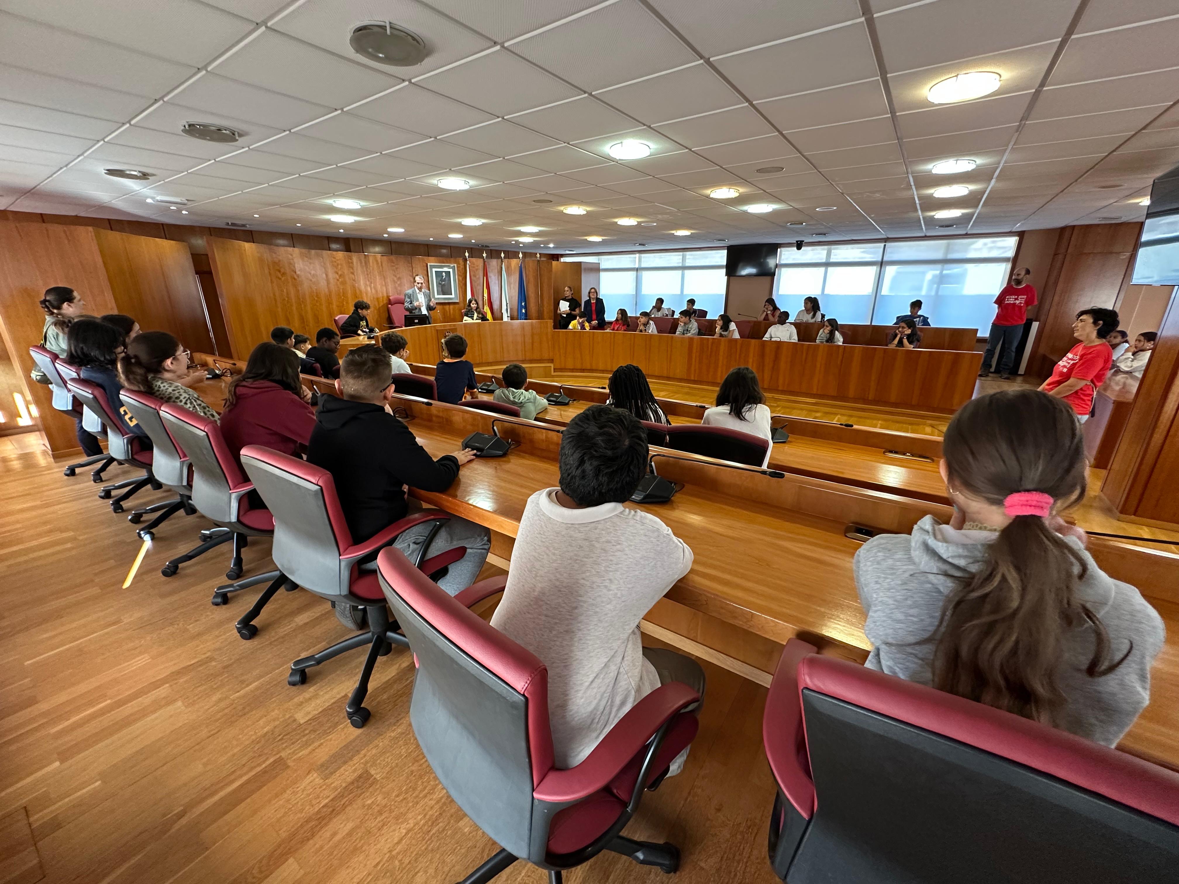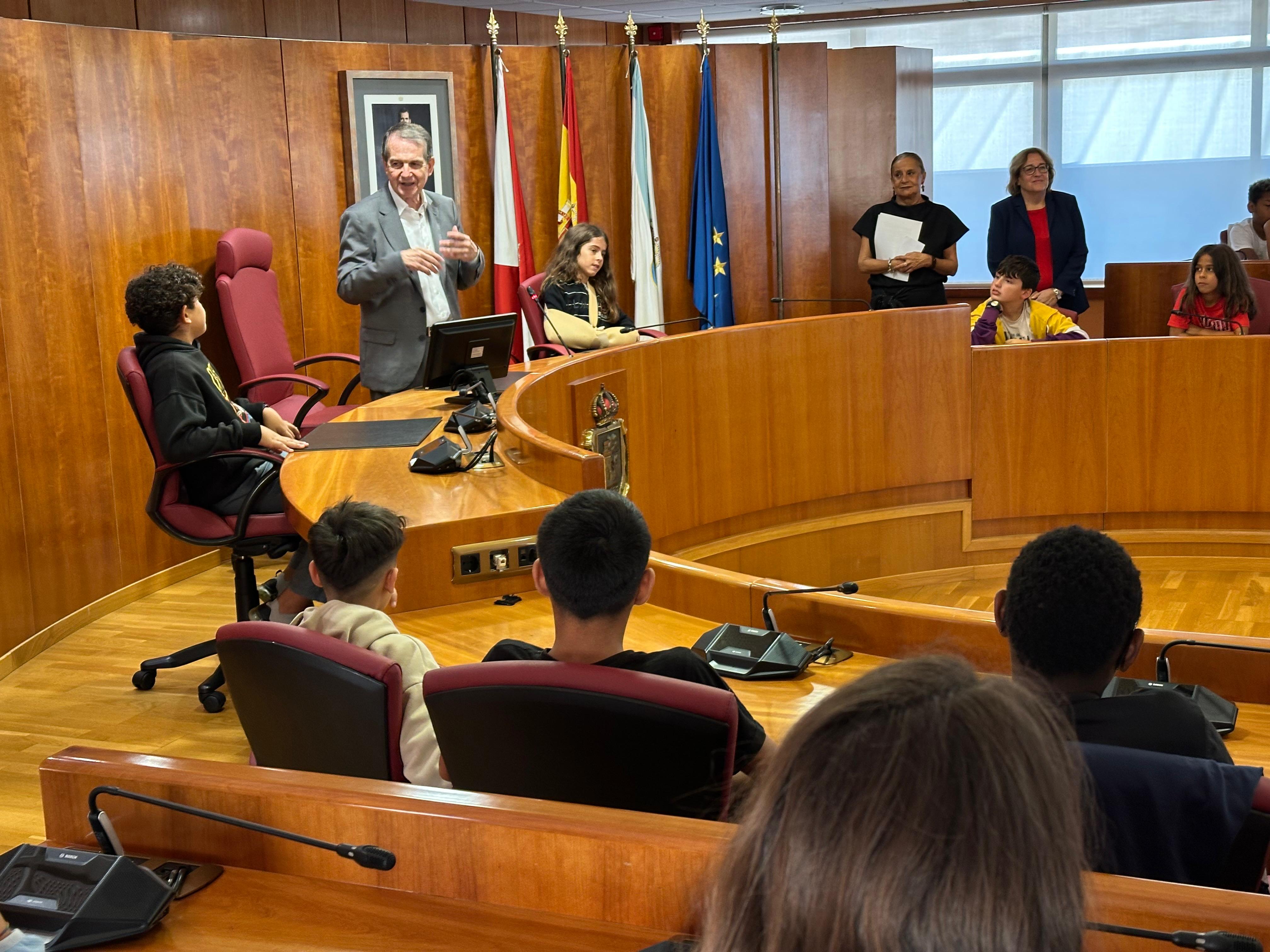 O alcalde, a primeira tenente de alcalde e a concelleira de Educación, recibiron este martes no Salón de Plenos do Concello a 44 alumnos de sexto de primaria do CEIP Frián Teis que participan no programa didáctico "Visita ou teu Concello". Abel Caballero, explicou a incidencia e a importancia das decisións que adopta o goberno municipal na calidade de vida de toda a cidadanía e para "sentir o orgullo de ser de Vigo".