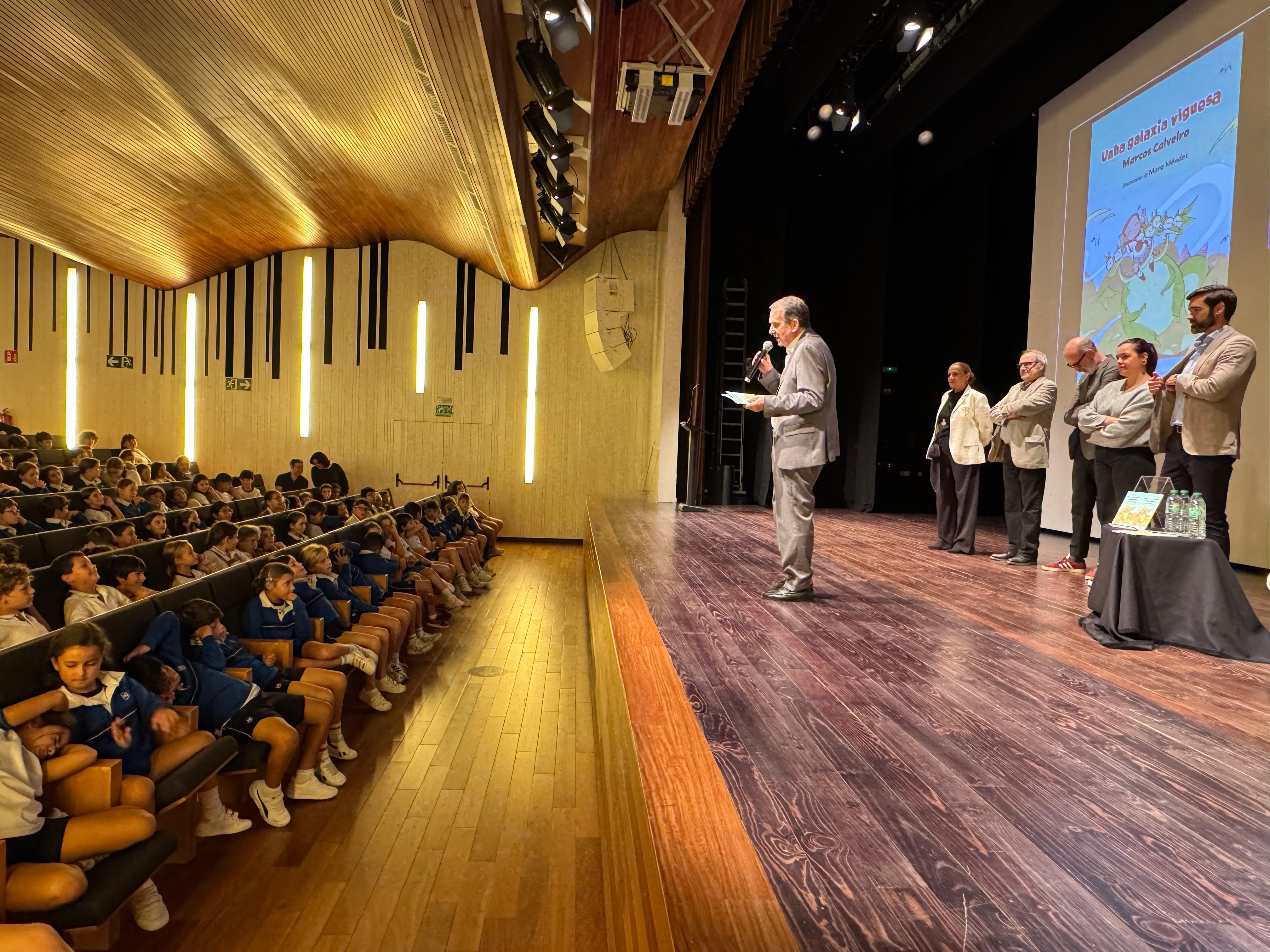 Abel Caballero participou esta mañá na presentación do libro infantil “Unha Galaxia Viguesa”, unha iniciativa enmarcada dentro da conmemoración do 75 aniversario da Editorial Galaxia. Acompañado polo director, Xosé Manuel Soutullo, o alcalde saudou ao alumnado de 5º y 6º de Primaria de distintos centros educativos que esta mañá visitaron o Auditorio Municipal ao que animou a adentrarse no mundo da lectura. Durante o acto, no que tamén participaron o escritor, Marcos Calveiro, e a ilustradora, Mara Méndez, Caballero louvou a traxectoria dunha empresa editorial comprometida co territorio e coa súa lingua. A colaboración entre Concello e Galaxia permitirá a distribución de 10.000 exemplares desta publicación entre os distintos colexios da cidade.