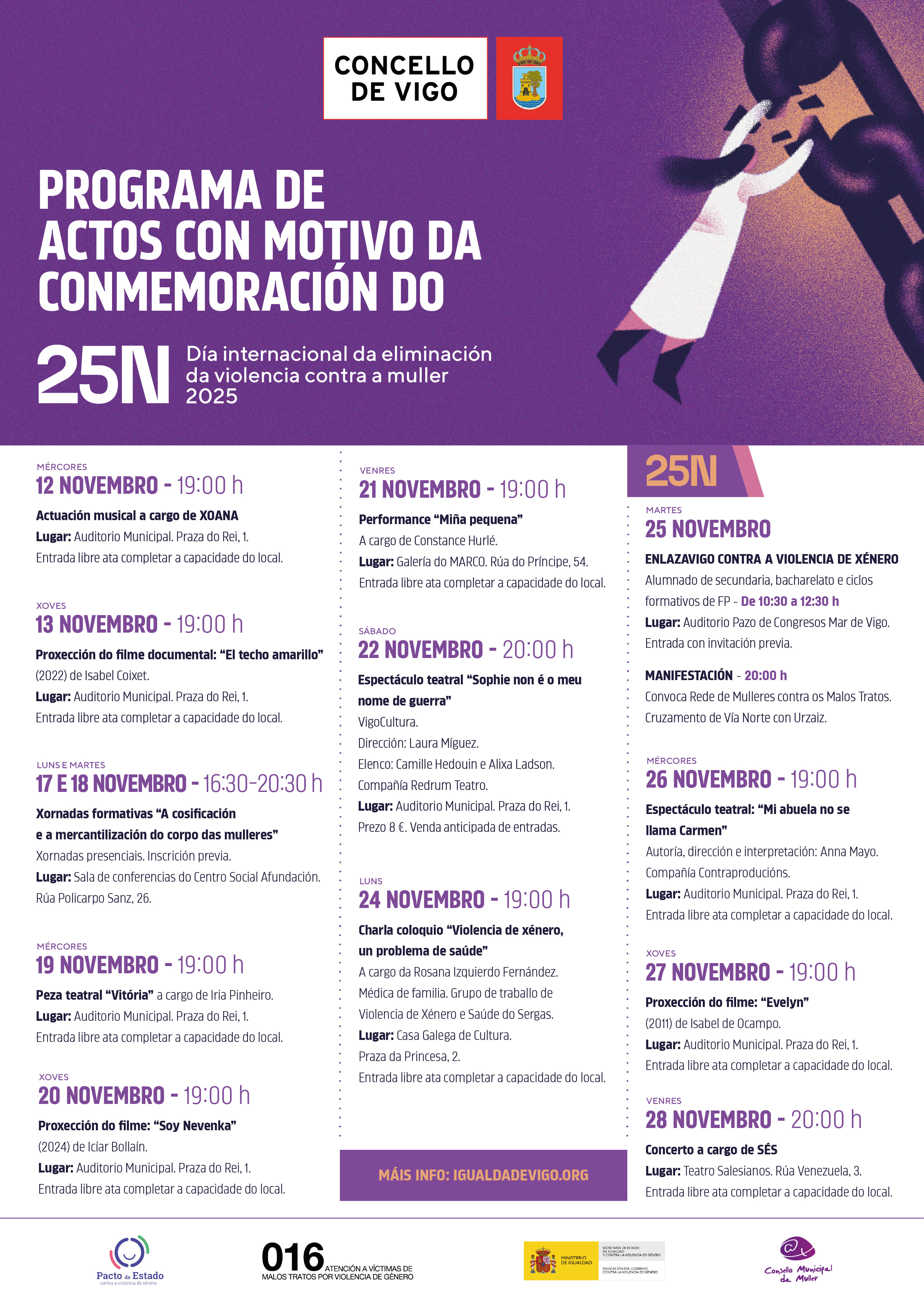 O día 25 de novembro o Auditorio Mar de Vigo acollerá o programa "Enlaza Vigo contra a violencia de xénero", coa participación do alumnado de secundaria, bacharelato e ciclos formativos de FP. A partir das 20.00 horas terá lugar a manifestación convocada pola Rede de Mulleres contra os Malos Tratos, desde ou cruzamento de Vía Norte a Urzáiz