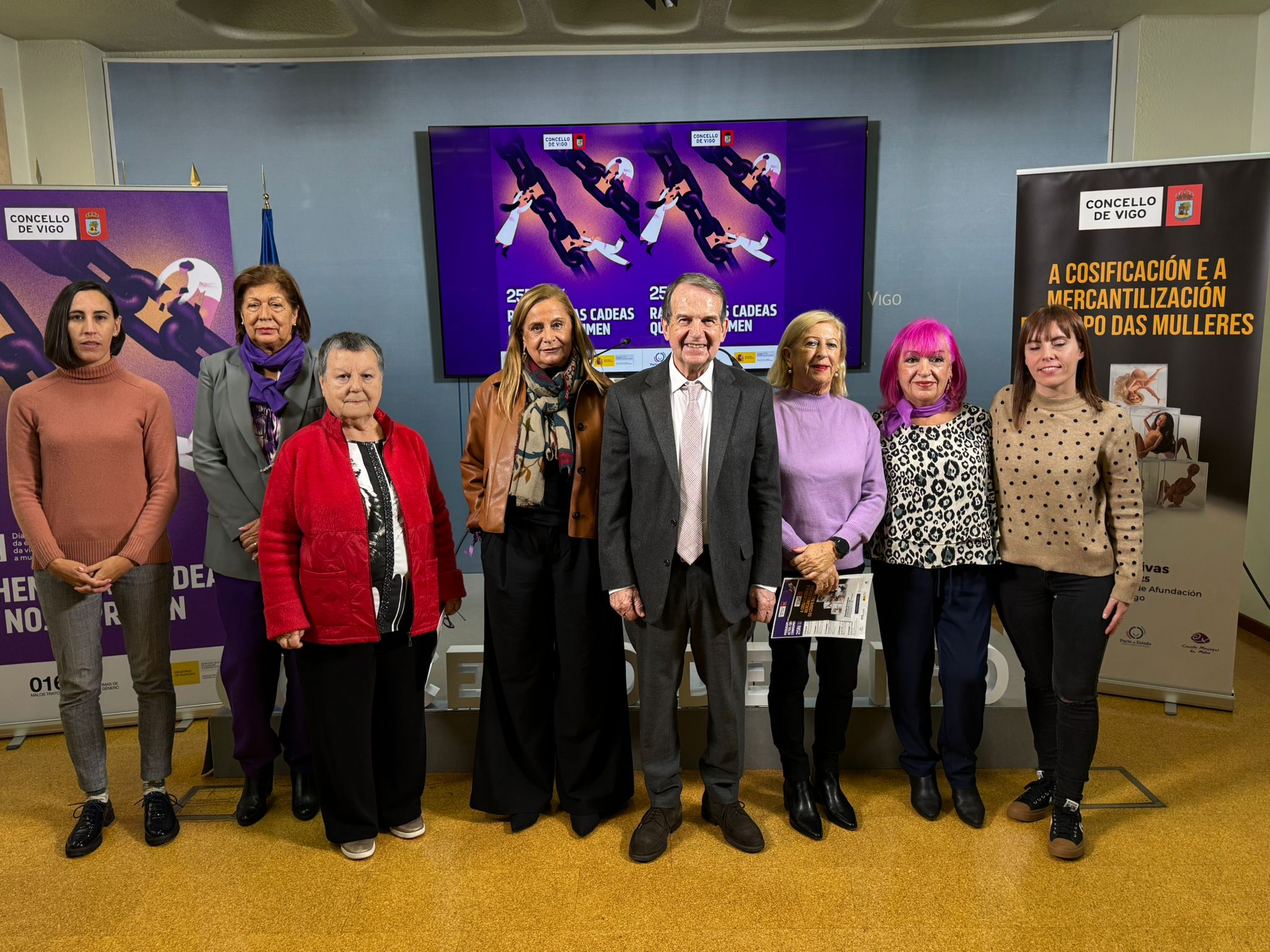 O alcalde presentou hoxe, coa primeira tenente de alcalde, a concelleira de Igualdade e as integrantes do Consello Municipal da Muller, o programa de actividades organizadas para conmemorar o 25N, o “Día Internacional da Eliminación da Violencia contra a Muller”, que este ano ten por lema “Rachemos as cadeas que nos oprimen”. Caballero avanzou que Vigo despregará, desde mañá e ata o 28 de novembro, “as accións máis importantes” organizadas nas cidades galegas.