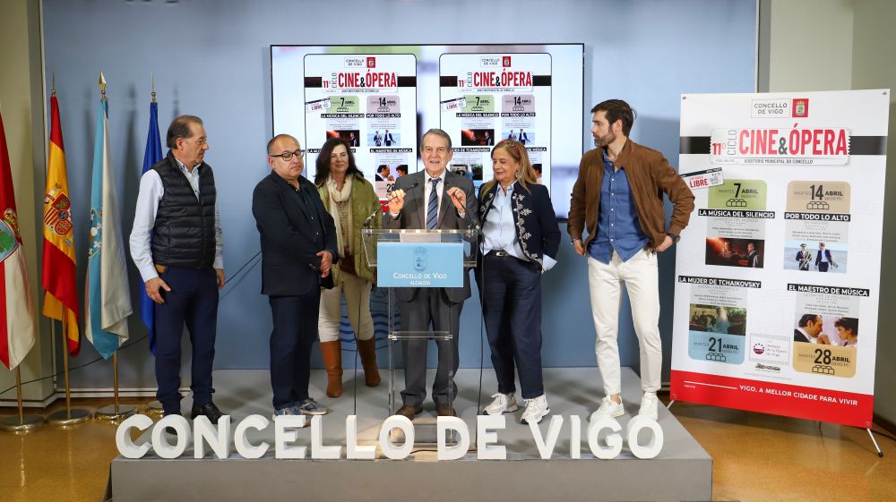 O alcalde, a primeira tenente de alcalde e o concelleiro de Cultura, presentaron hoxe co director, o tesoureiro e a secretaria da Asociación Amigos da Ópera de Vigo, as catro películas do ciclo que reflicte a presenza e influencia da ópera no cinema que se desenvolverá durante todos os martes do mes de abril.