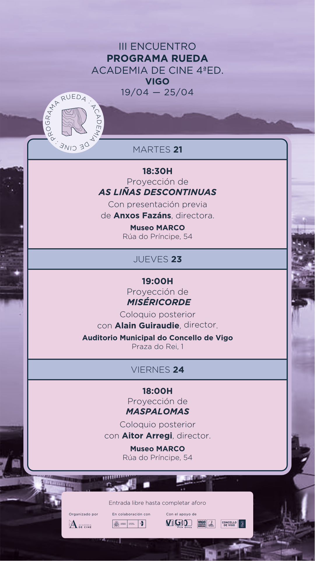 As proxeccións abertas á cidadanía comezarán o martes 21 de abril coa proxección de As liñas descontinuas no Museo MARCO, que contará coa presentación da súa directora, Anxos Fazáns. O xoves 23 de abril, no Auditorio do Concello, proxectarase Miséricorde, seguida dun coloquio con Alain Guiraudie, un dos cineastas máis singulares do cinema francés contemporáneo. Por último, o venres, o MARCO recibirá a Aitor Arregi e a historia que dirixiu xunto a José María Goenaga, Maspalomas, que conquistou o Goya ao Mellor Actor Protagonista para José Ramón Soroiz.