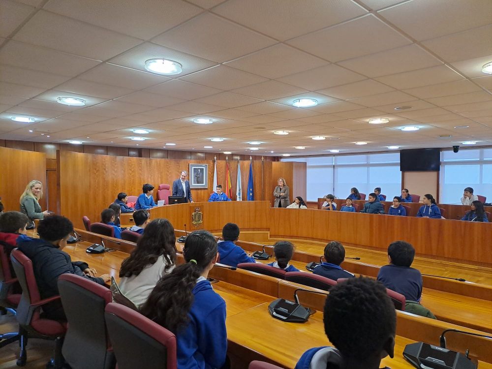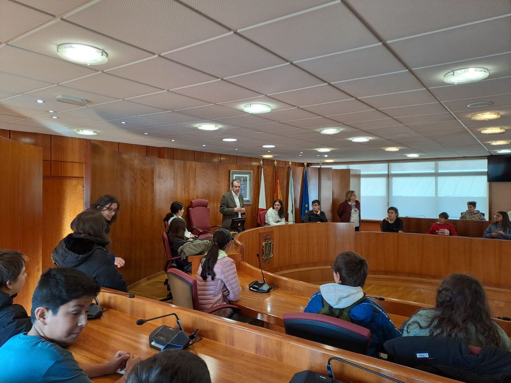 Abel Caballero recibiu este xoves, no Salón de plenos do Concello, a 44 alumnos de 5ª e 6ª de Educación Primaria do CPR San Fermín que participan no programa didáctico "Visita ou teu Concello". O alumnado percorreu as instalacións dos principais servizos municipais para mellorar os seus coñecementos sobre o funcionamento da administración municipal e a súa incidencia na vida da cidadanía. O alcalde explicou ao estudantado a importancia das decisións que se adoptan no Concello para mellorar a calidade de vida das viguesas e vigueses.