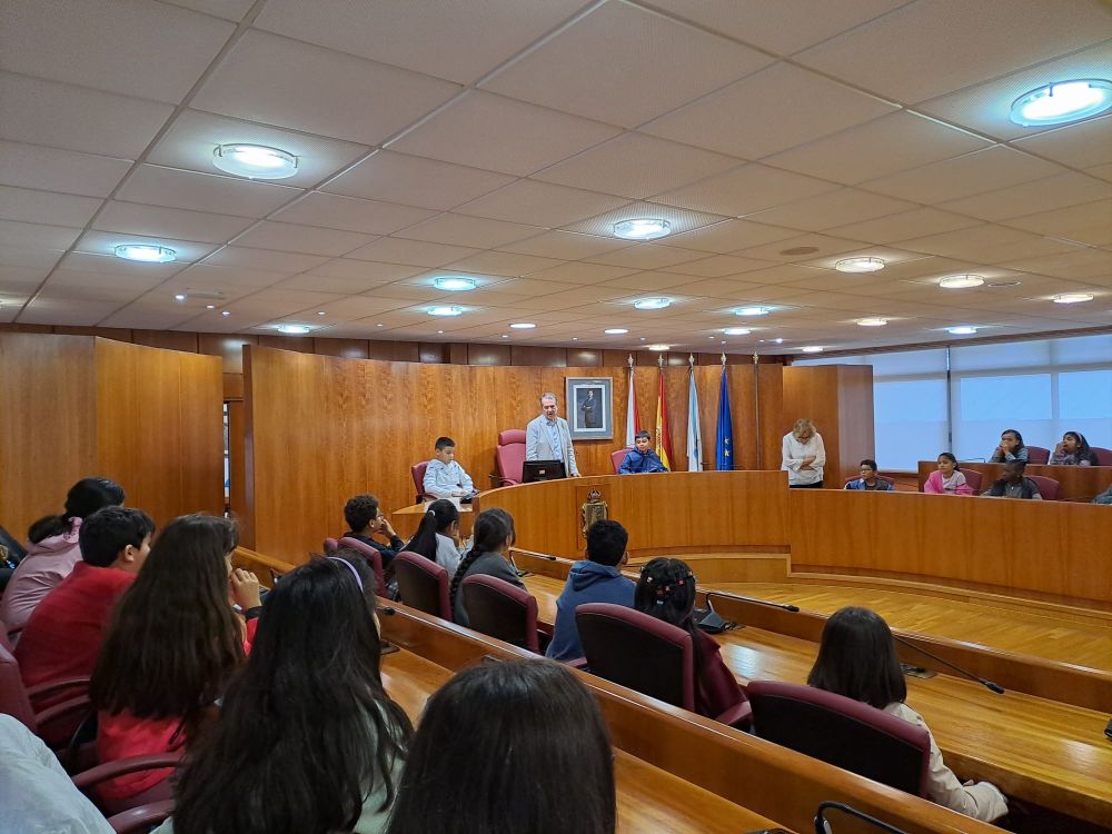Abel Caballero explicou hoxe aos 34 alumnos de 4ª e 5ª de Educación Primaria do CEIP Ramón y Cajal que participan no programa didáctico "Visita ou teu Concello" a transcendencia do traballo que desenvolve a administración municipal para favorecer o benestar de toda a cidadanía e proporcionarlle servizos esenciais. Os escolares visitaron as dependencias municipais para mellorar o seu coñecemento sobre o funcionamento do Concello.